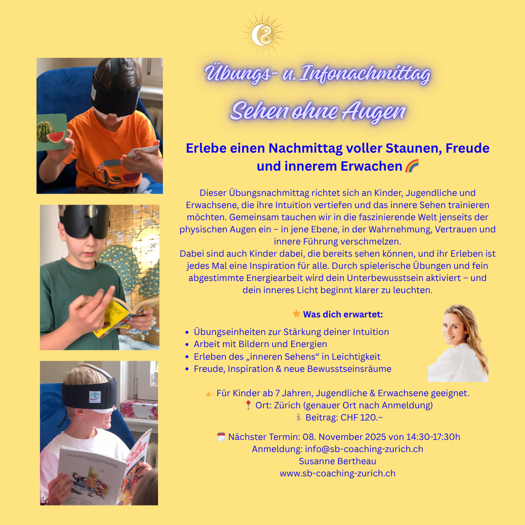 Sehen ohne Augen – Übungs- und Infonachmittag 08.11.25 Für alle, die Wunder erleben wollen und erfahren möchten, wie der Supermensch in ihnen wieder aktiviert werden kann! Datum Samstag, 08. November 25 Zeit 14.30 - 17.30 Uhr Ort Dufourstrasse 85, 8008 Zürich Preis CHF 120.00 Sehen ohne Augen – Übungs- und Infonachmittag 08.11.25 CHF 120.00 In den Warenkorb